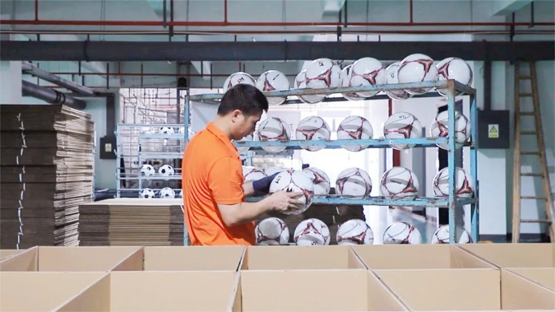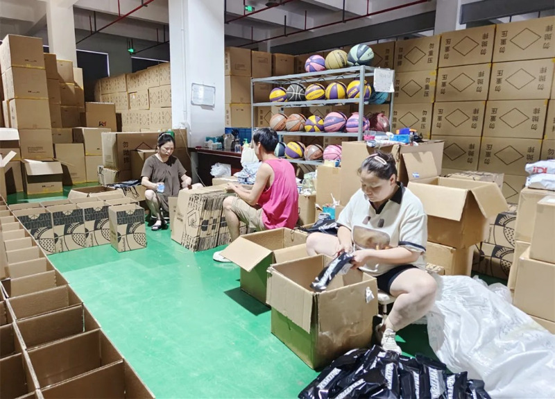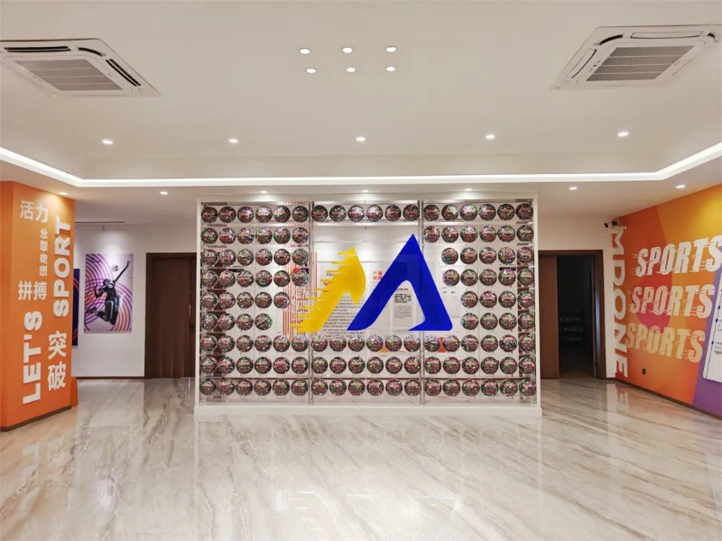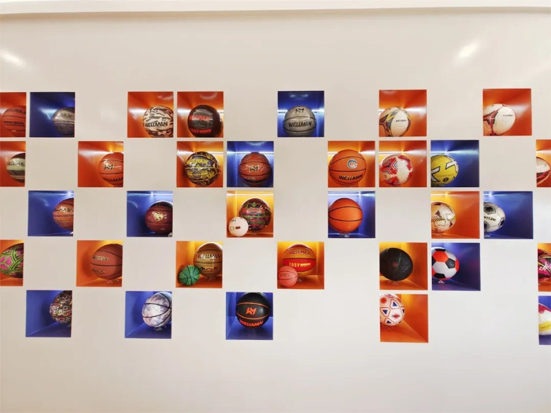 ในโชว์รูมผลิตภัณฑ์ของ Meidong Sports มีผลิตภัณฑ์บาสเก็ตบอลฟุตบอลและวอลเลย์บอลหลายสิบรายการที่มีสไตล์และสีสันสดใส